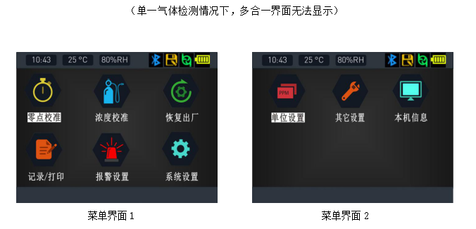 ●高清2.5寸彩屏顯示實時濃度、報警、時間、溫度、濕度、存儲、通信、打印、電量、充電狀態(tài)等信息,菜單界面采用高清仿真圖標(biāo)顯示各個菜單的功能名稱
