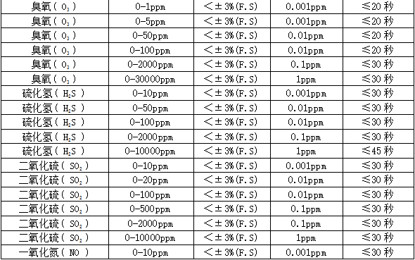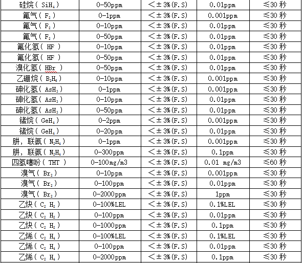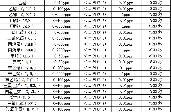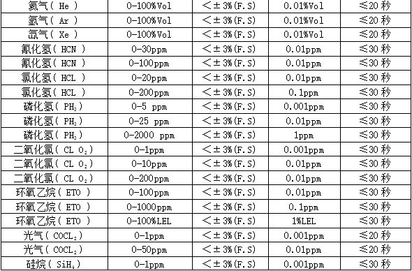 檢測范圍:0~1、10、100、1000、5000、50000、100000ppm、200毫克/升、100%LEL、20%、50%、99.999%、100%Vol可選,其他量程可訂制。
